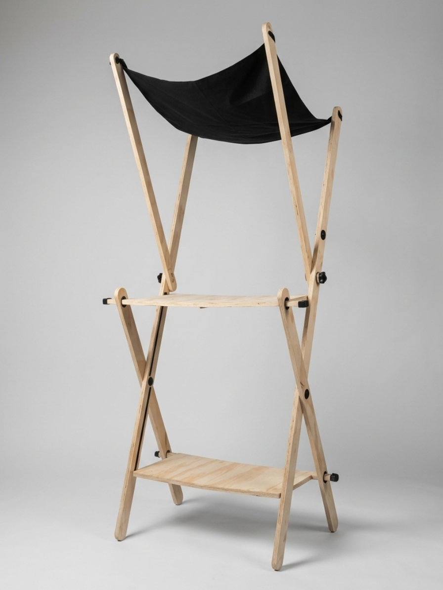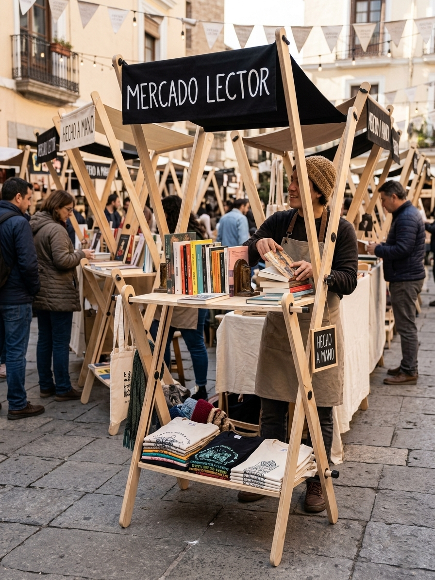 Solución portátil para feriantes. Diseñada con enfoque ergonómico para montarse, desmontarse y trasladarse fácilmente entre distintos espacios urbanos.