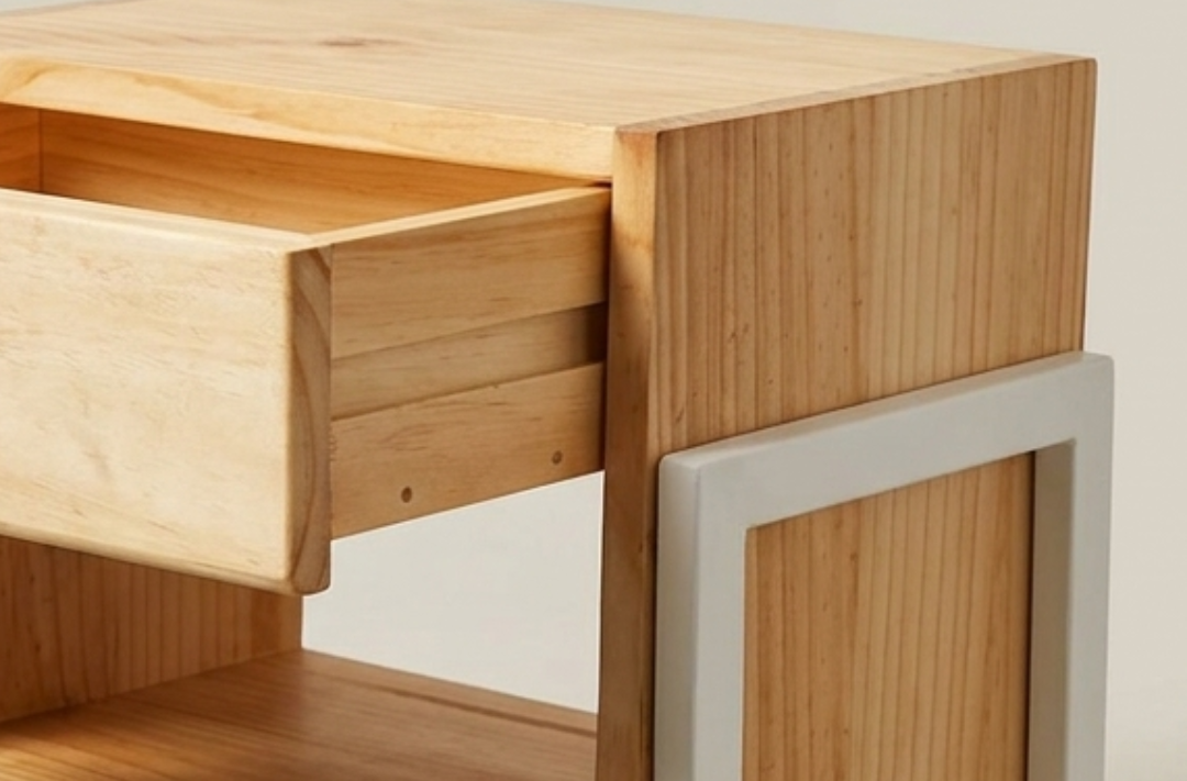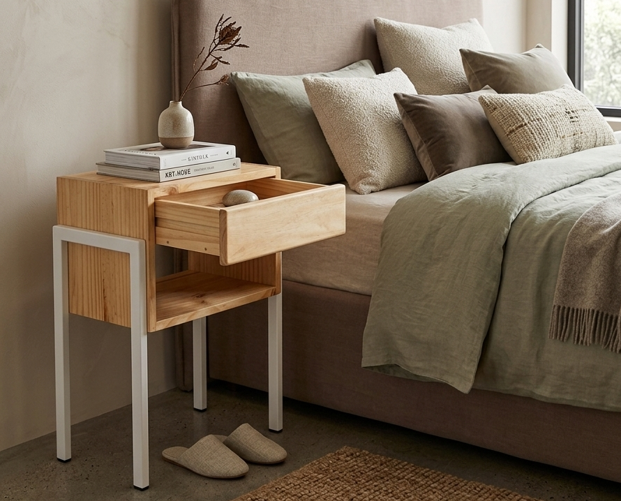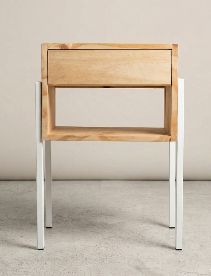 Mesa de noche hecha en madera de pino con una base metálica. El foco fue probar distintas formas de unir la madera sin usar tornillos visibles, buscando un resultado limpio y bien cuidado.